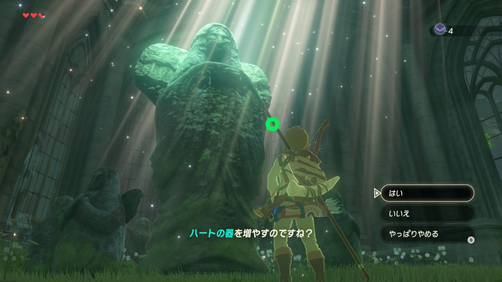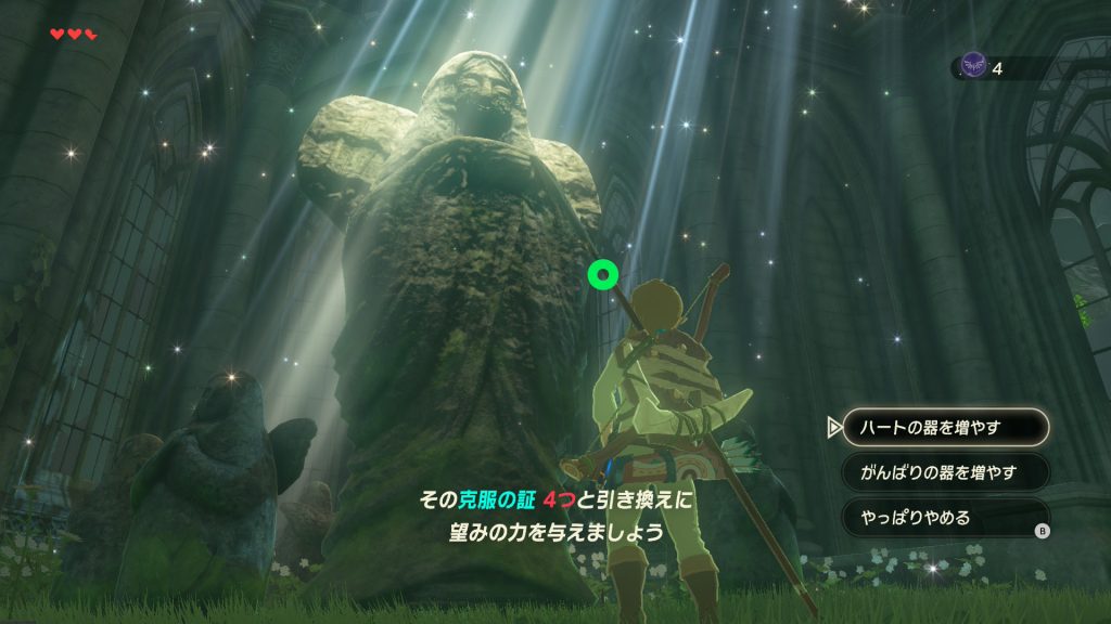 がんばりも大事そうなことはわかるけど、いまは何よりこの心もとない体力を何とかしたいので、迷わずハートの器を増やすことを選択。
