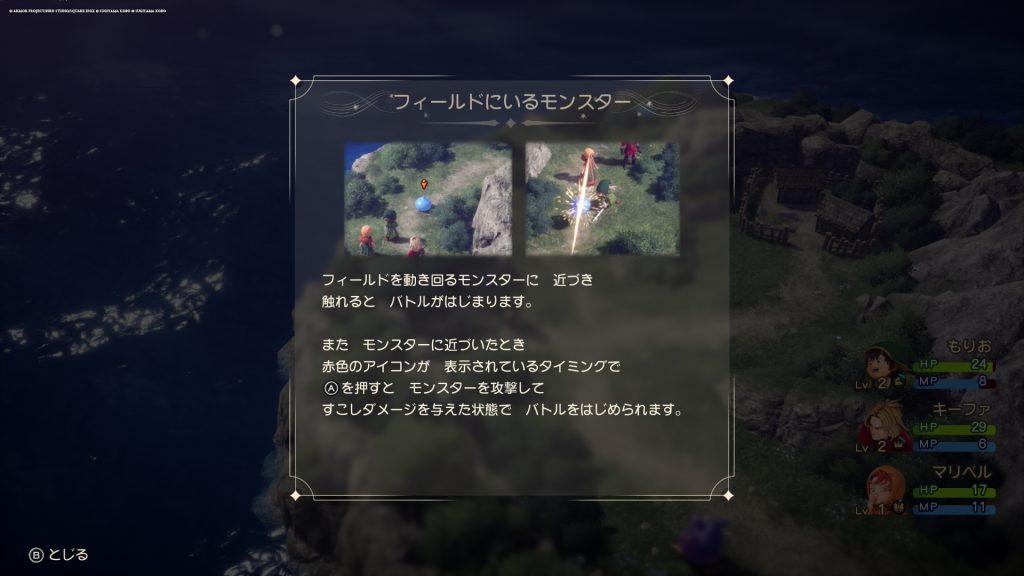 本作はシンボルエンカウントシステムを採用していますが、目の前にいる敵とバトルに入る前にAボタンを押すことで少し相手にダメージを与えた状態でバトルを開始することができます。