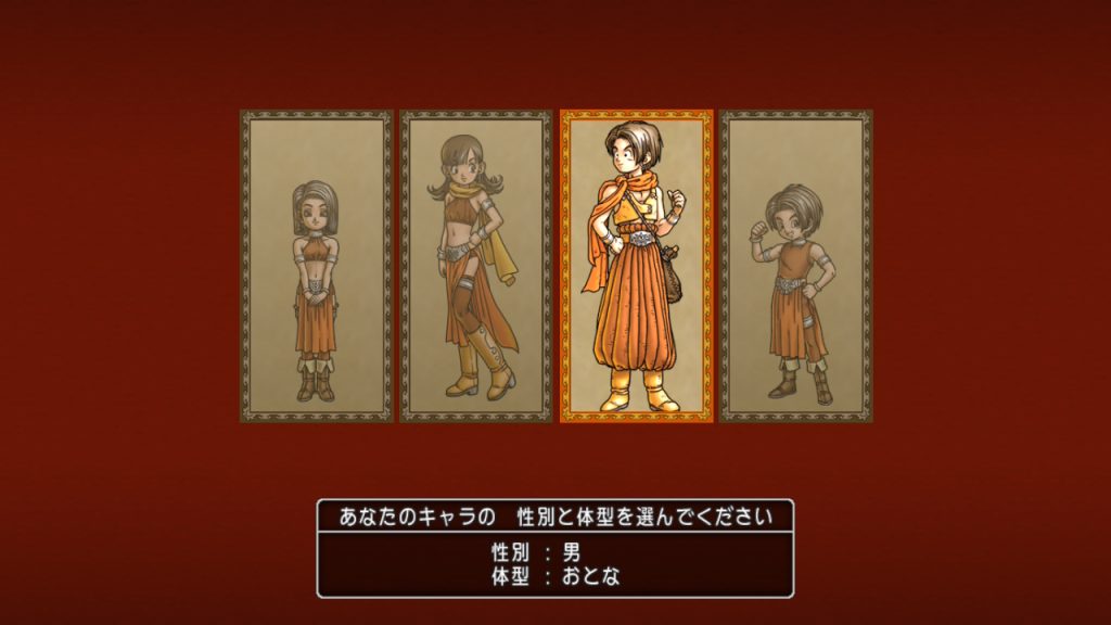 ドラクエ10では男女、大小の4パターンからベースを選択して、そこからオリジナルキャラを作成していきます。
