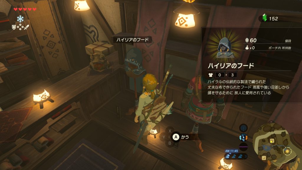 ということで、とりあえず一番手ごろなフードだけ買いました。頭装備なかったので、まずはフードをかぶるのが防御力が一番上がるしね。